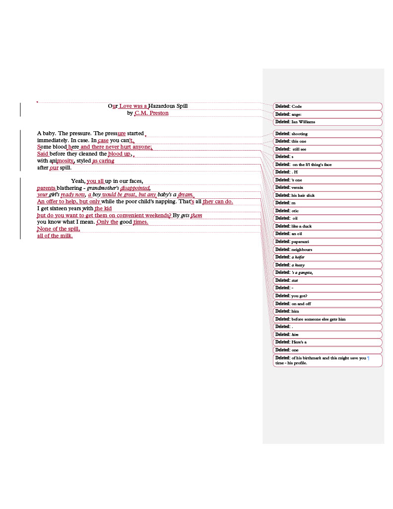 Our Love was a Hazardous Spill C.M. Preston is a Canadian poet currently attending the MFA program at The University of British Columbia. Share this: Share on X (Opens in new window) X Share on Facebook (Opens in new window) Facebook Like Loading...